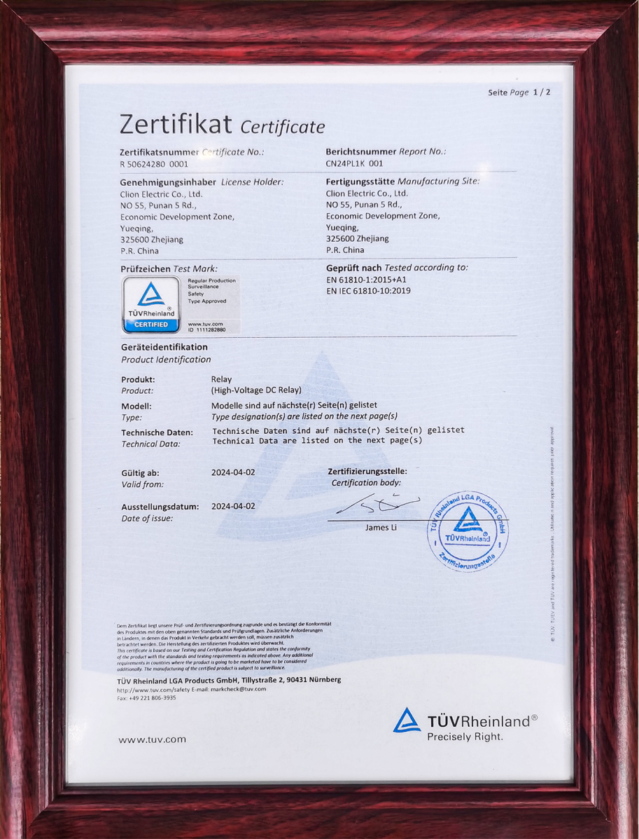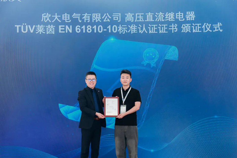 4月11日,欣大電氣高壓直流繼電器產品,成功通過EN IEC 61810-10: 2019標準認證,國際獨立第三方檢測、檢驗和認證機構德國萊茵TüV集團正式為欣大電氣頒發認證證書。浙江欣靈電氣銷售有限公司銷售總監周仕程、TüV萊茵大中華區太陽能與商業產品服務零部件業務總經理施兵等雙方代表出席本次頒證儀式。
