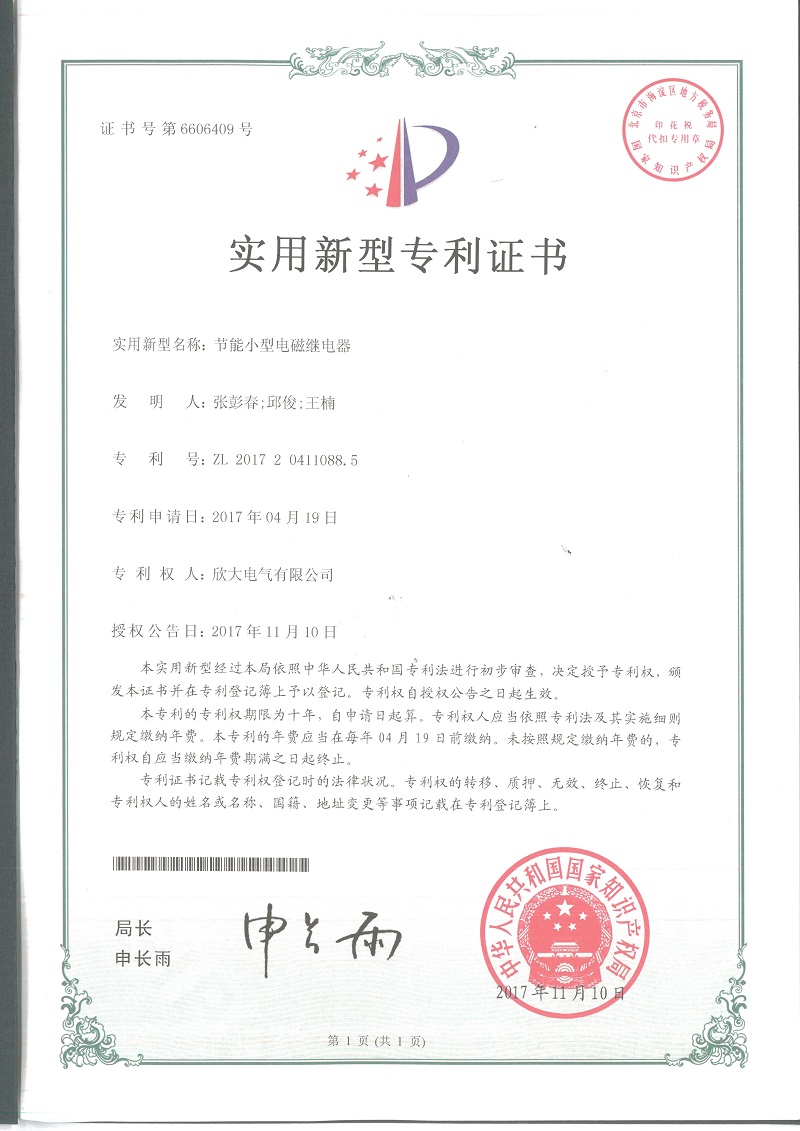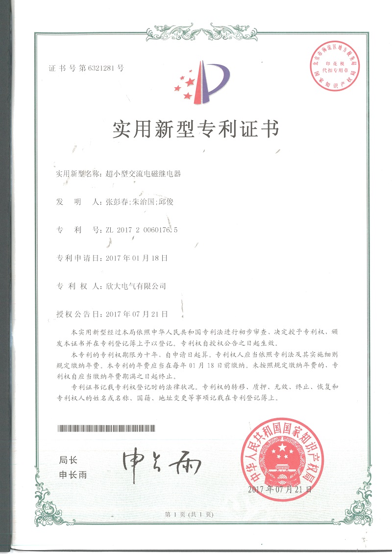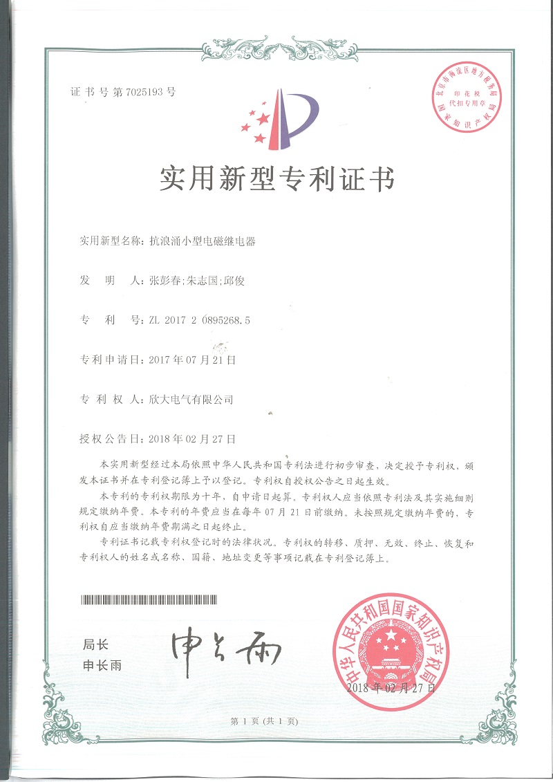 [專利證書]抗浪涌小型(xing)電磁繼(ji)電器(實用(yong))