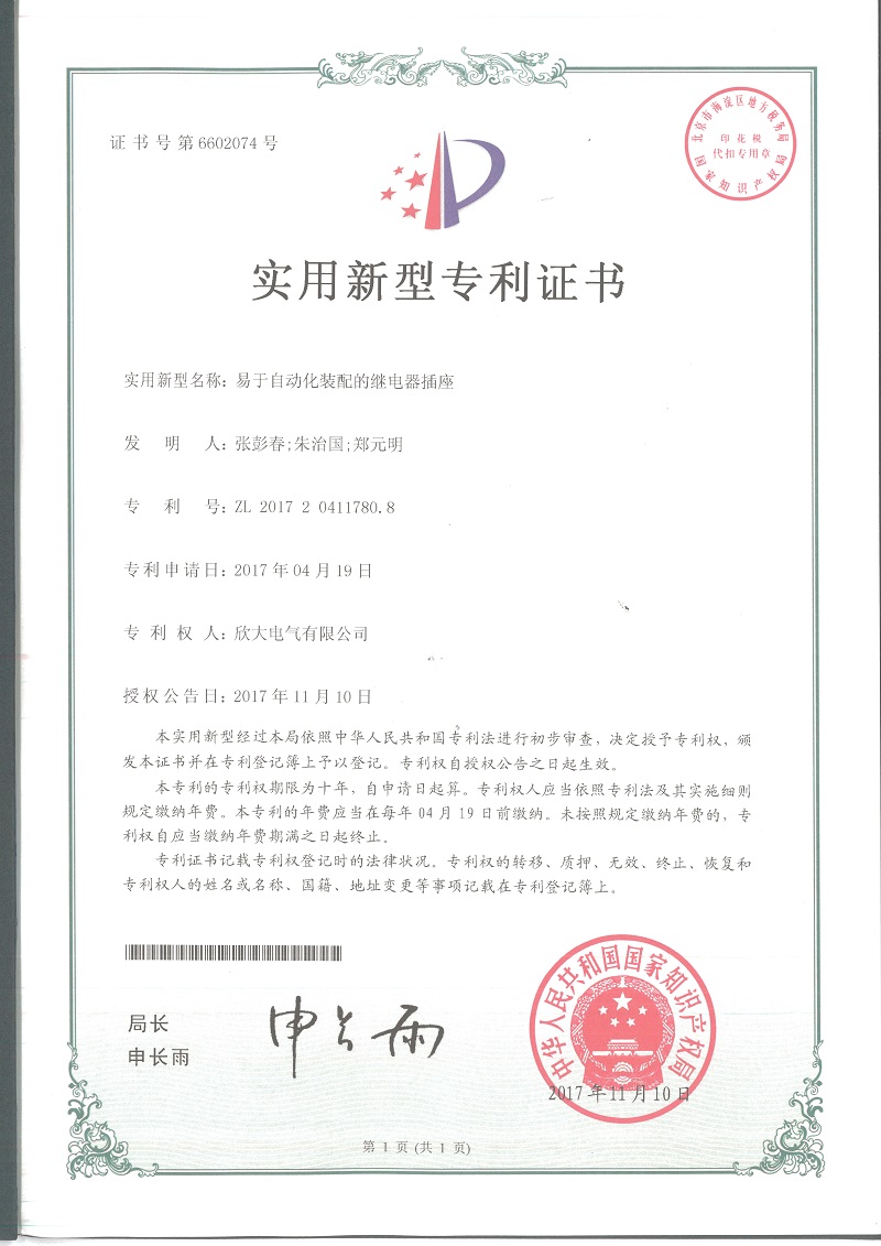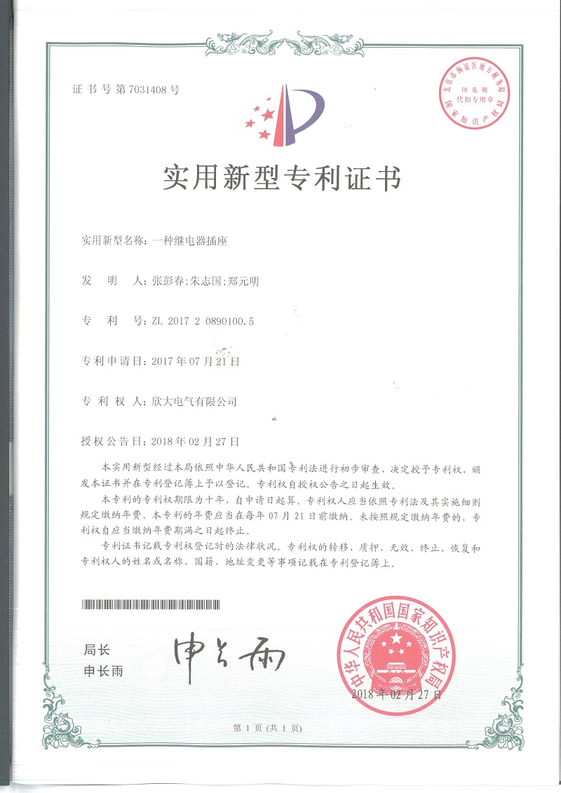 [專利證書(shu)]一(yi)種(zhong)繼(ji)電器插座(實用)
