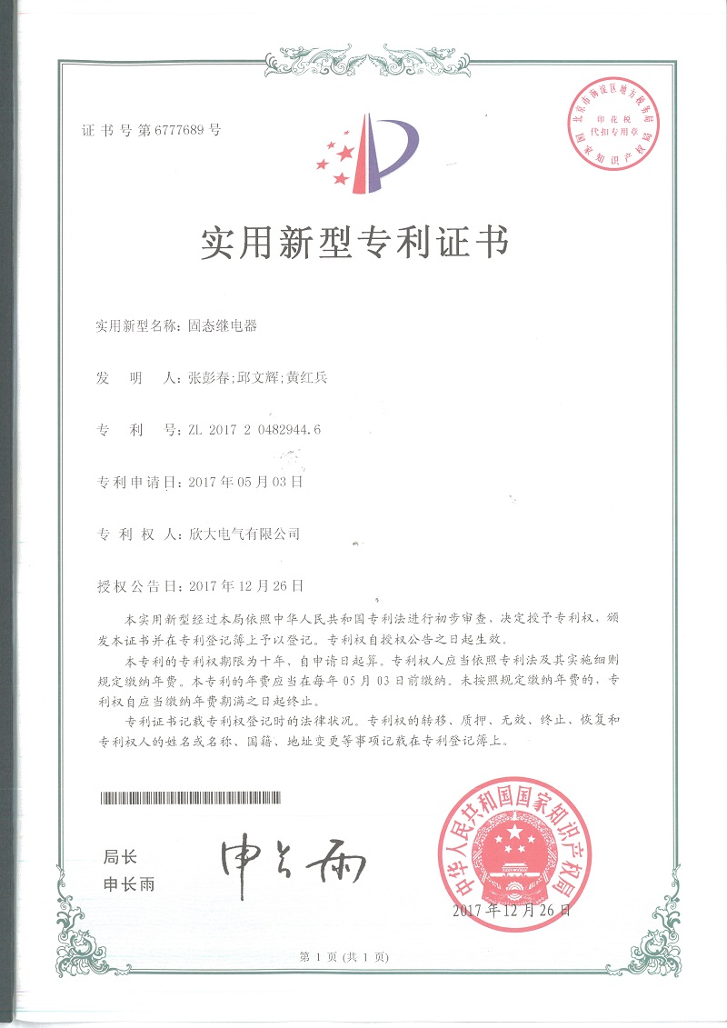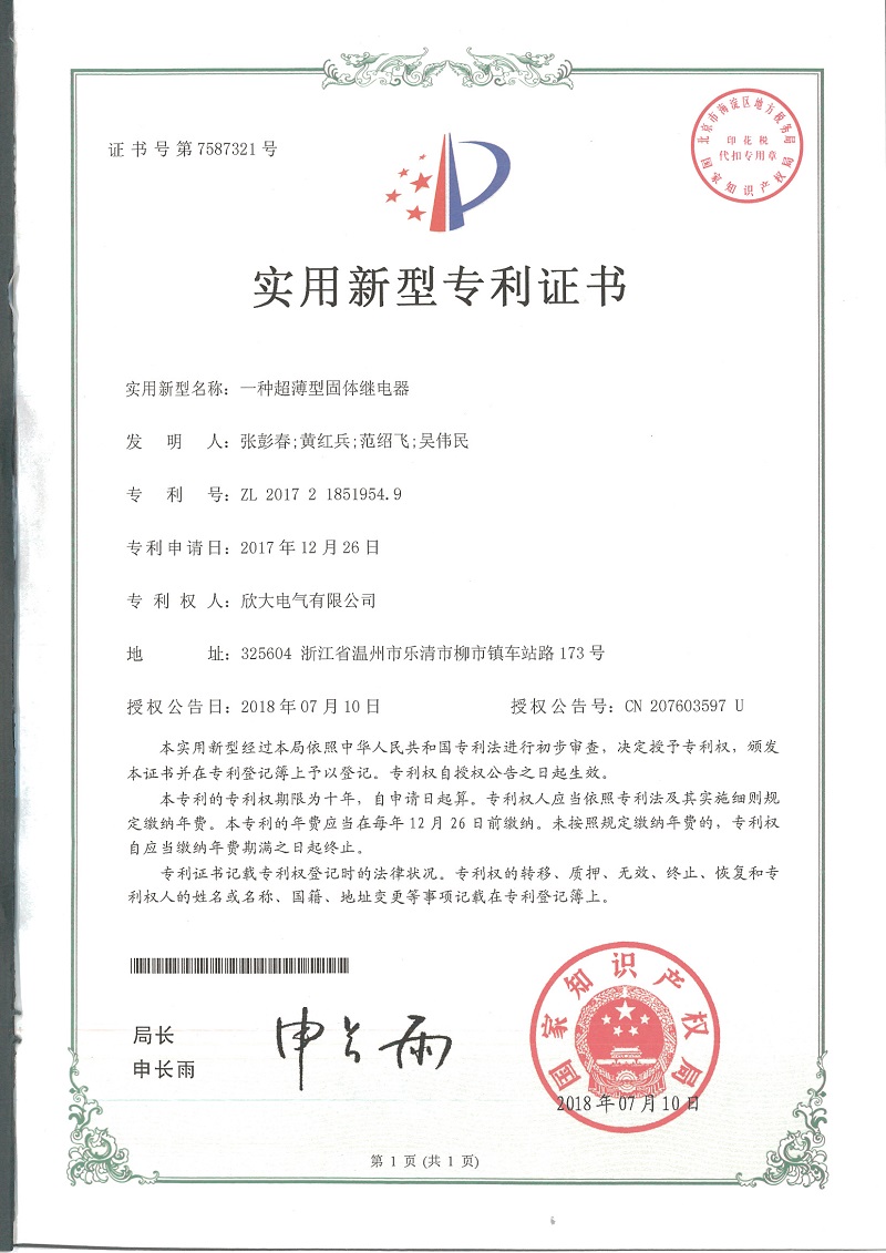 [專利證書]一種超薄型固體繼(ji)電(dian)器(qi)(實用(yong))