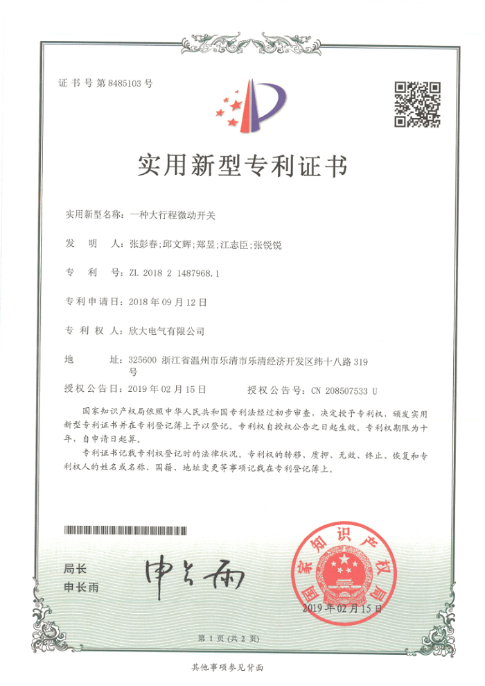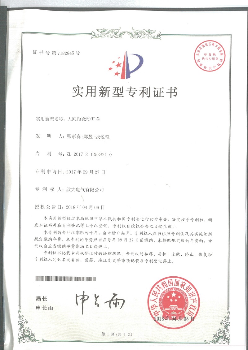 [專利證書]一種大行程微動開(kai)關(guan)(實用)