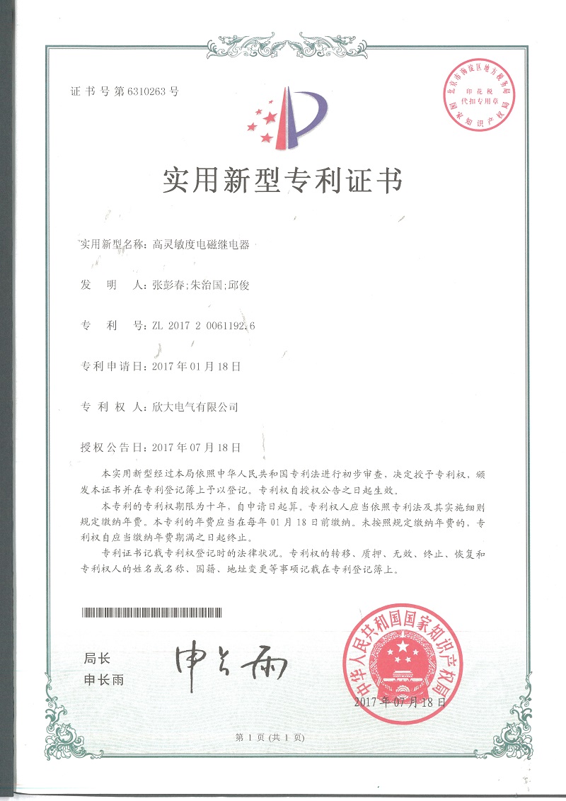 [專利證書]高靈敏度電(dian)磁繼電(dian)器(實用)