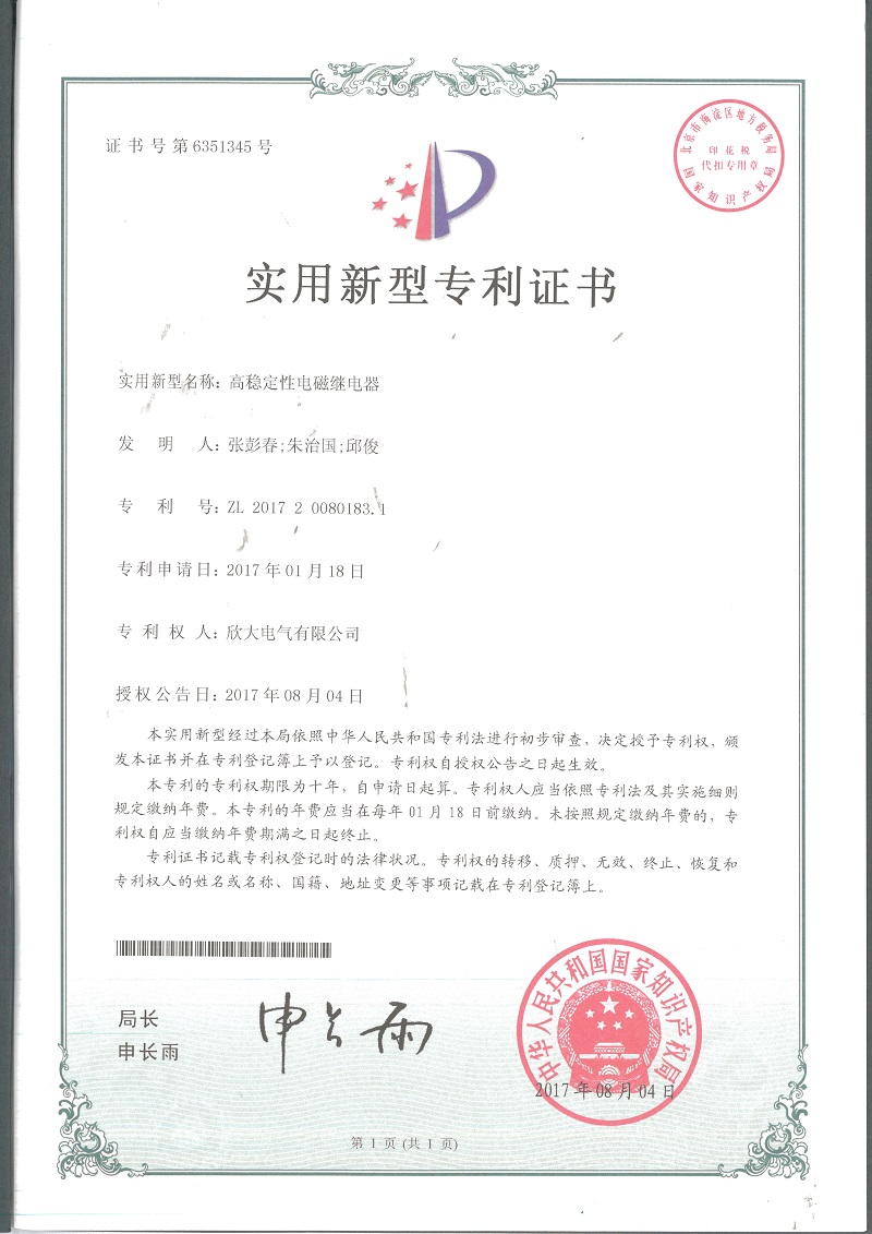 [專(zhuan)利證書(shu)]高穩定(ding)性電磁繼電器(實用)