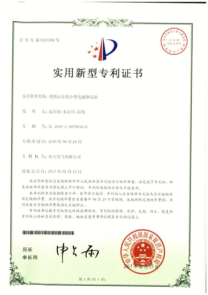 [專利證書(shu)]帶指示燈的小(xiao)型電磁繼電器(實用)