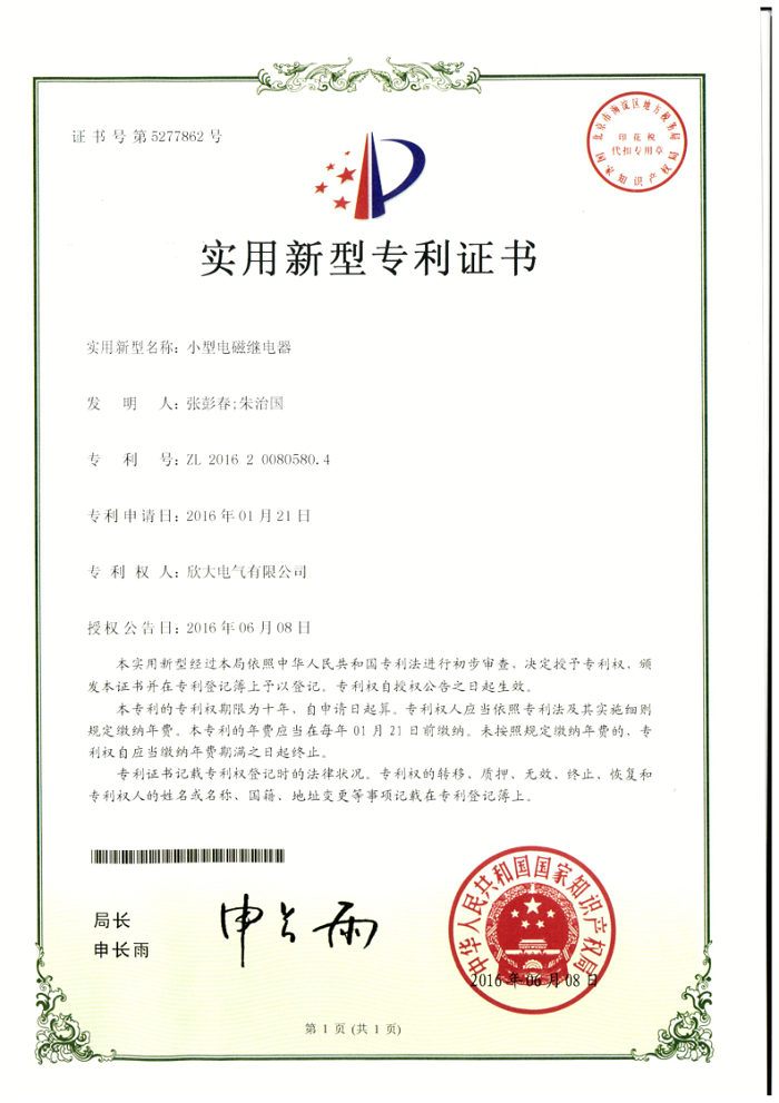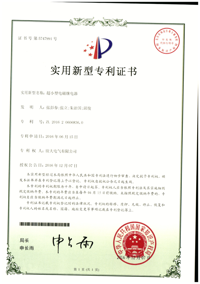 [專利證書]超小型電(dian)磁繼電(dian)器(實用)