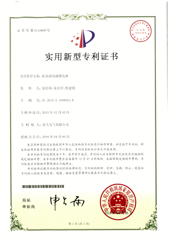 [專利證書]抗浪涌(yong)電磁繼電器(實用)