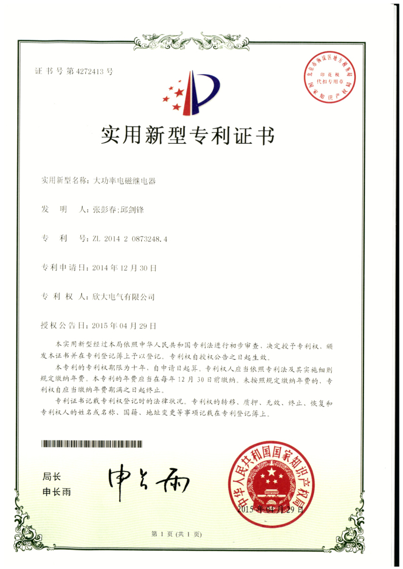 [專(zhuan)利(li)證書]大功率(lv)電磁(ci)繼電器(qi)(實(shi)用)