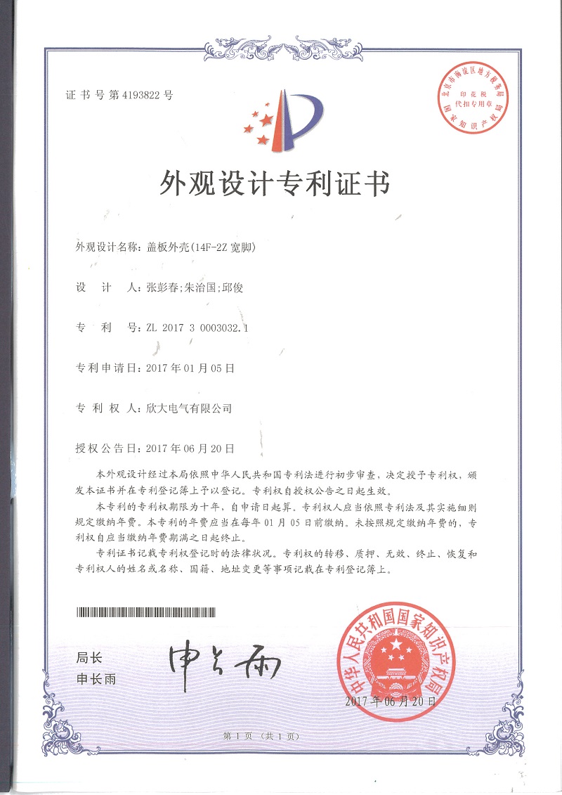 [專利證書(shu)]蓋板外(wai)殼(14F?2Z寬腳)(外(wai)觀)