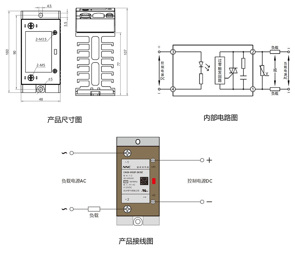 產品技術參數控制電壓 4-32VDC 控制電流 <20mA 接通電壓 4VDC 關斷電壓 1VDC 反向電壓 32VDC 負載電壓 40-440VAC 負載電流 20A、25A、30A
