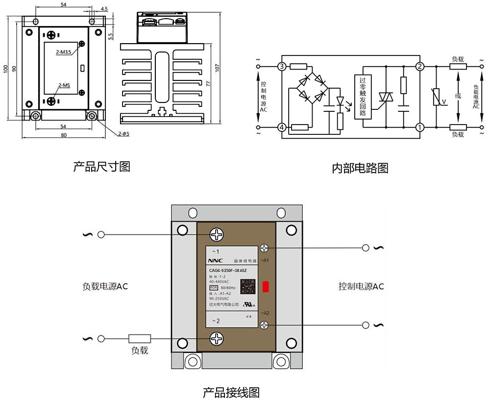 產品技術參數控制電壓 90-250VAC 控制電流 <20mA 接通電壓 90VDC 關斷電壓 10VDC 反向電壓 / 負載電壓 40-440VAC 負載電流 40A
