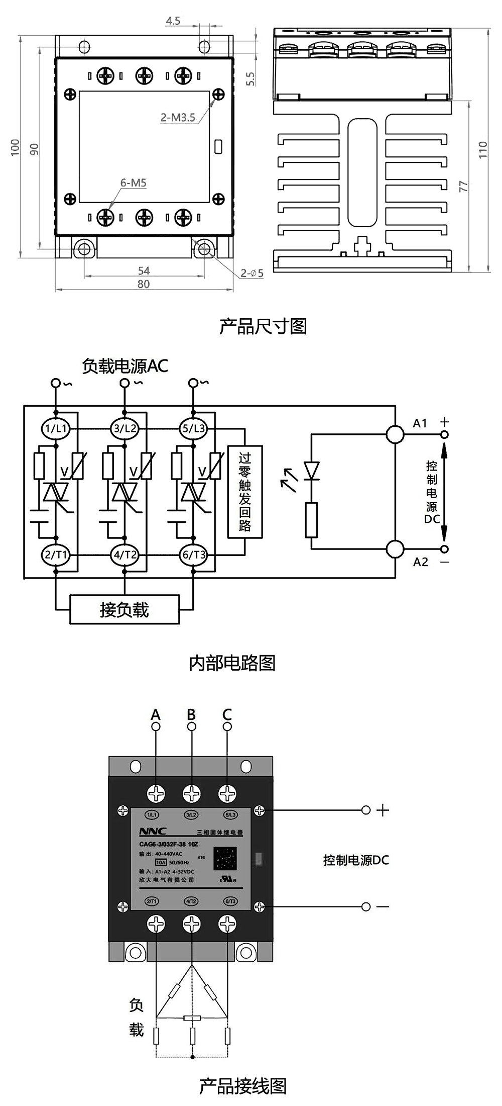 ①三相交流電路的進線無相序要求,導線粗細按實際使用電流選擇。輸出端接負載。