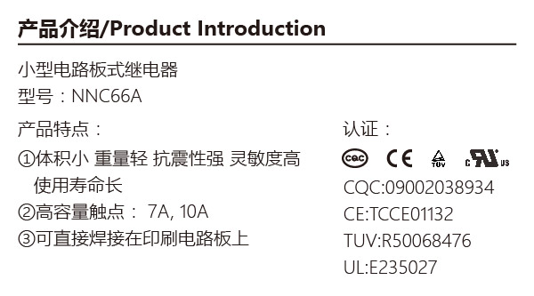 - 欣大電氣NNC66A(T73)系列小型線路板式電磁繼電器采用無塵車間加工技術及全自動化生產線,選用優質銀合金觸點,上等銅材,符合ROHS標準的元器件及原材料,密封設計,國際標準尺寸及安裝方式,具有高容量,靈敏度強,耐久性好,內部防水防塵,壽命長等優點,廣泛應用于家用電器,PCB線路板,工業控制系統,自動化控制系統等領域。
