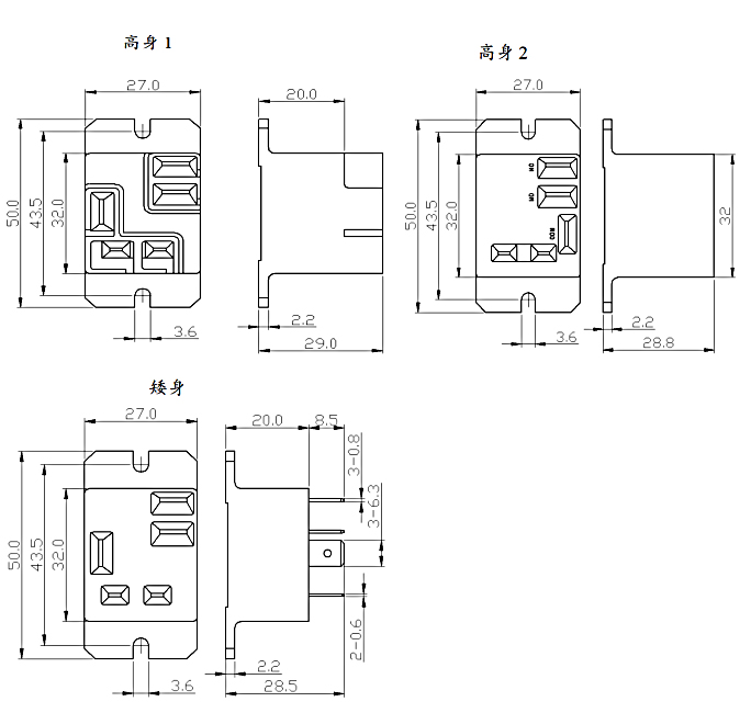 外形尺寸、安裝孔與線路圖(單位:mm)