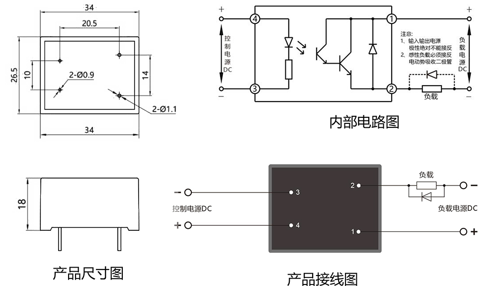 產品技術參數控制電壓 3-32VDC 控制電流 6-25mA 接通電壓 3VDC 關斷電壓 1VDC 反向電壓 32VDC 負載電壓 12-200VDC 負載電流 2A、3A、4A