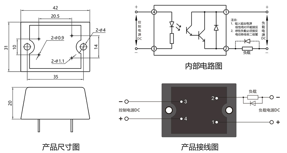瞬態電壓 220VDC 通態壓降 ≤1.2VDC 通斷時間 ≤5ms 斷態漏電流 ≤5mA 介質耐壓 ≥1500VAC 絕緣電阻 100MΩ,500VDC 測試 環境溫度 -30~80℃ 安裝形式 雙列直插、線路板焊接 產品重量 ≈38g 外形尺寸 35×31×20mm 說明 安裝在通風較好的散熱窗旁邊 產品尺寸及接線方式