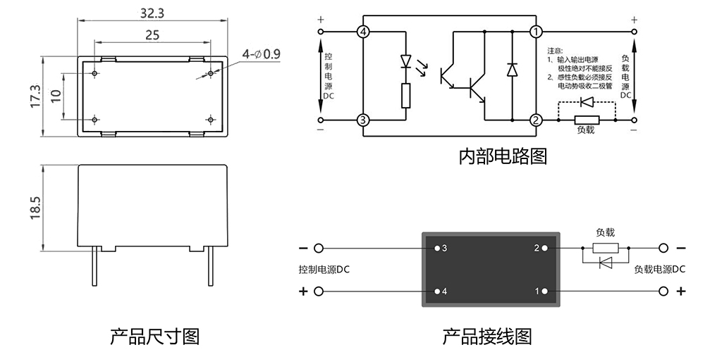 產品技術參數控制電壓 3-32VDC 控制電流 6-25mA 接通電壓 3VDC 關斷電壓 1VDC 反向電壓 32VDC 負載電壓 12-200VDC 負載電流 1A