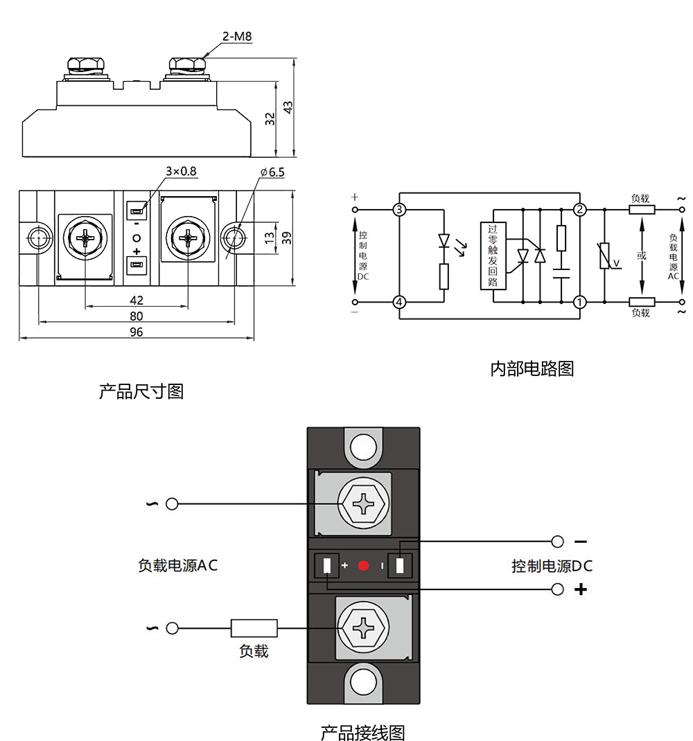 ①安裝時請務必在電源側加裝aR 型快速熔斷器,空氣開關等保護,以防止短路,造成產品永久性失效。選取熔斷器電流等級的原則為略大于負載電流。阻性負載和感性負載宜用