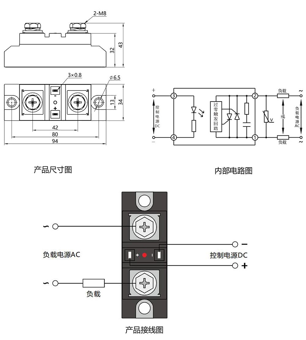 ①安裝時請務必在電源側加裝aR 型快速熔斷器,空氣開關等保護,以防止短路,造成產品永久性失效。選取熔斷器電流等級的原則為略大于負載電流。阻性負載和感性負載宜用