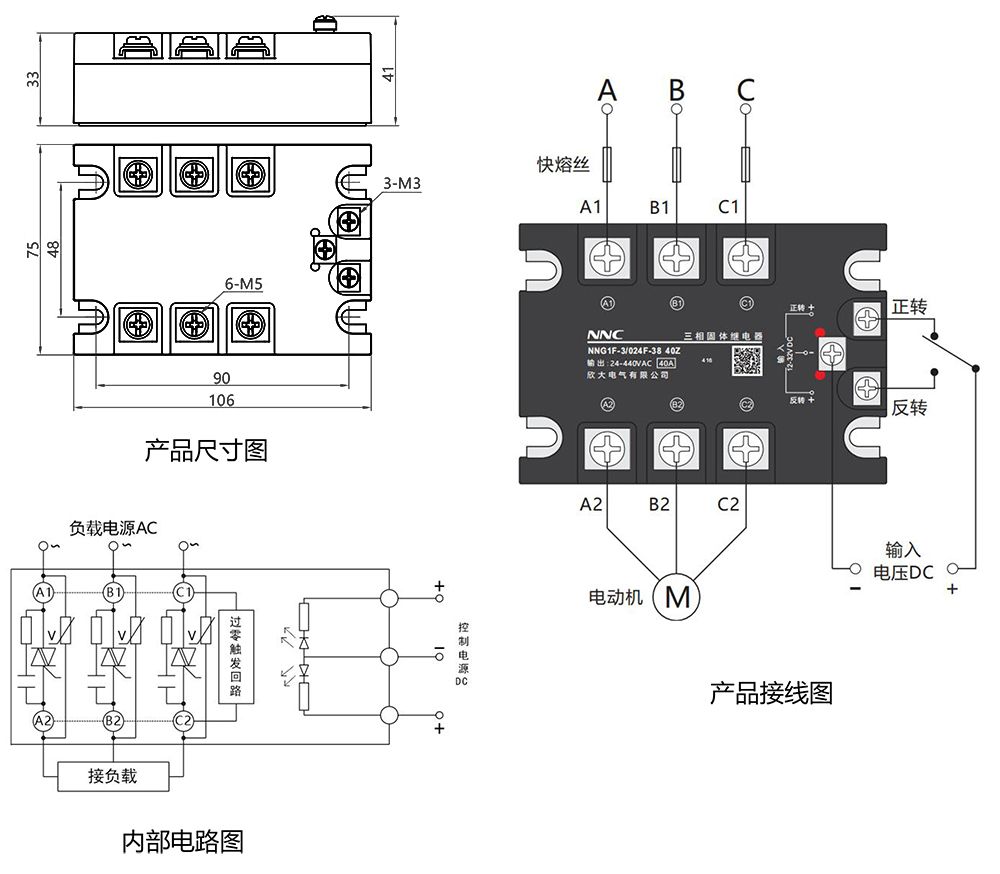 產品技術參數控制電壓 024:12-32VDC 控制電流 ≤50mA 接通電壓 12VDC 關斷電壓 5VDC 反向電壓 32VDC 負載電壓 24-440VAC 負載電流 10A、15A、20A、25A、30A、40A、60A、80A 瞬態電壓 900VAC 通態壓降 ≤1.6VAC 通斷時間 ≤10ms 正反轉延時時間 ≥200ms 斷態漏電流 ≤10mA 介質耐壓 ≥2500VAC 絕緣電阻 100MΩ,500VDC 測試 環境溫度 -30~80℃ 安裝形式 螺栓安裝 產品重量 10-40A≈360g、60-80A≈500g 外形尺寸 106×75×41mm 說明 負載5A 以上必須安裝散熱器,60℃以上必須加風扇強冷或者水冷 產品尺寸及接線方式