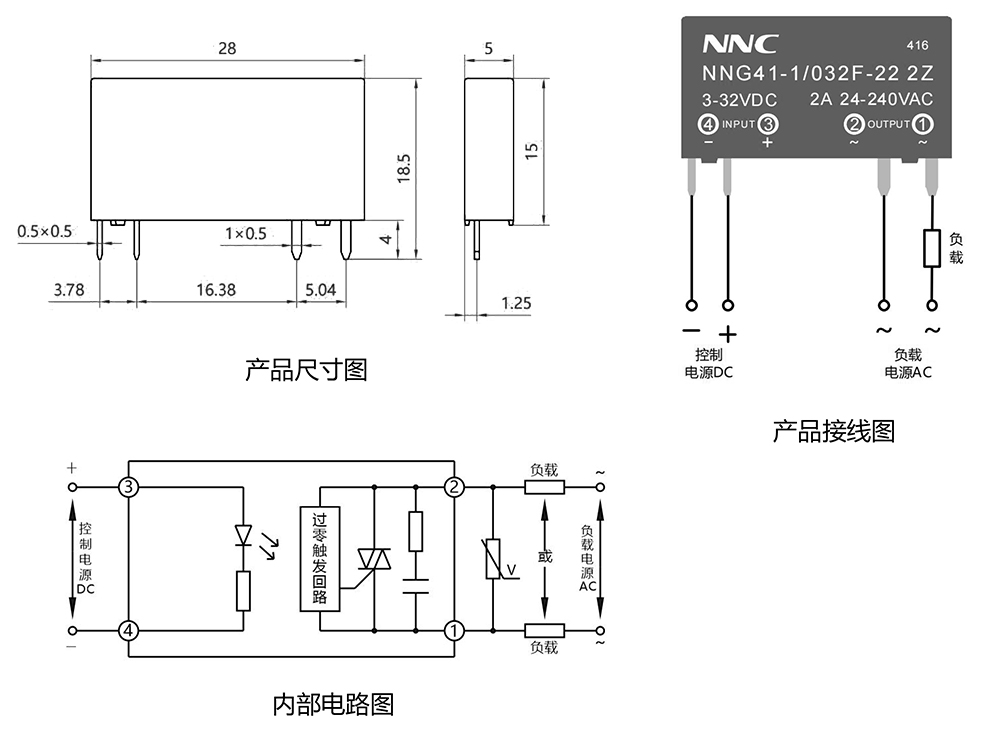 產品技術參數控制電壓 3-32VDC 控制電流 5-20mA 接通電壓 3VDC 關斷電壓 1VDC 反向電壓 32VDC 負載電壓 22:24-240VA 38:24-440VAC 負載電流 1A、2A