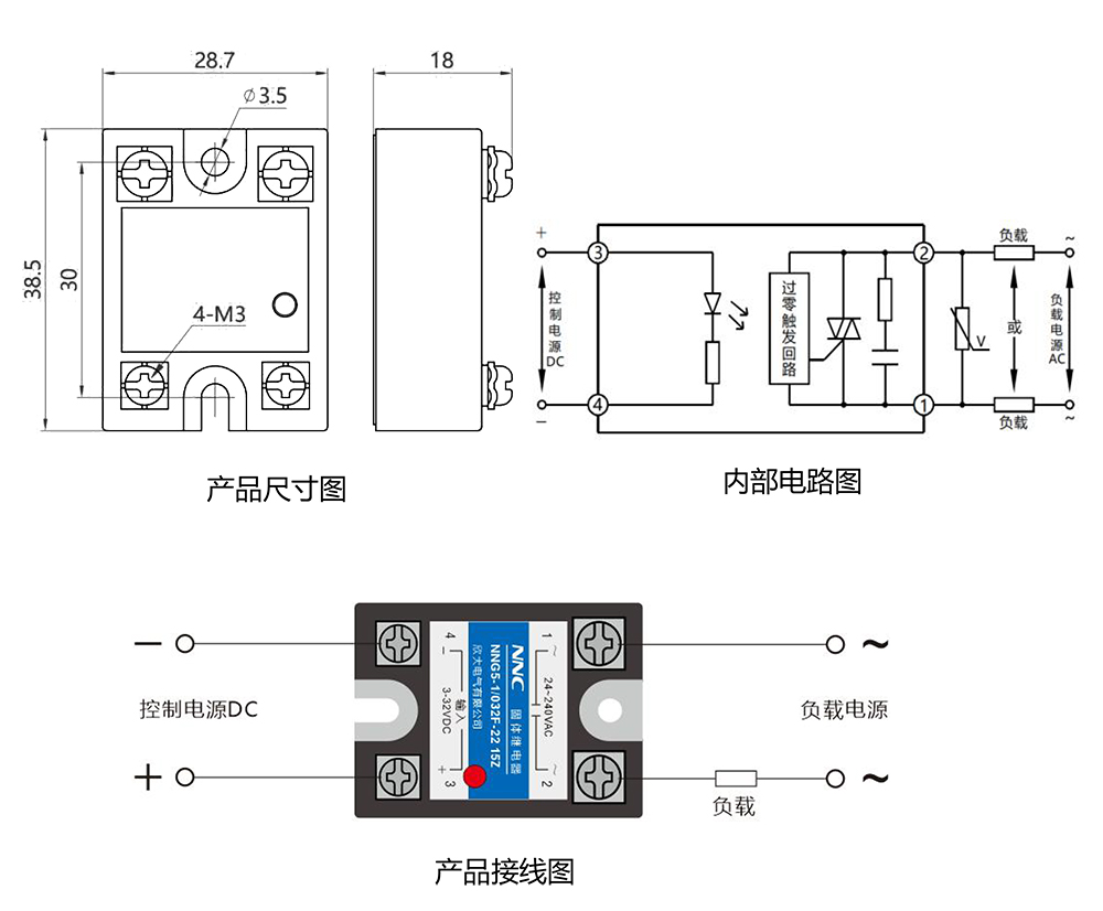 產品技術參數控制電壓 3-32VDC 控制電流 6-25mA 接通電壓 3VDC 關斷電壓 1VDC 反向電壓 32VDC 負載電壓 22:24-240VA 38:24-440VAC 負載電流 5A、10A、15A