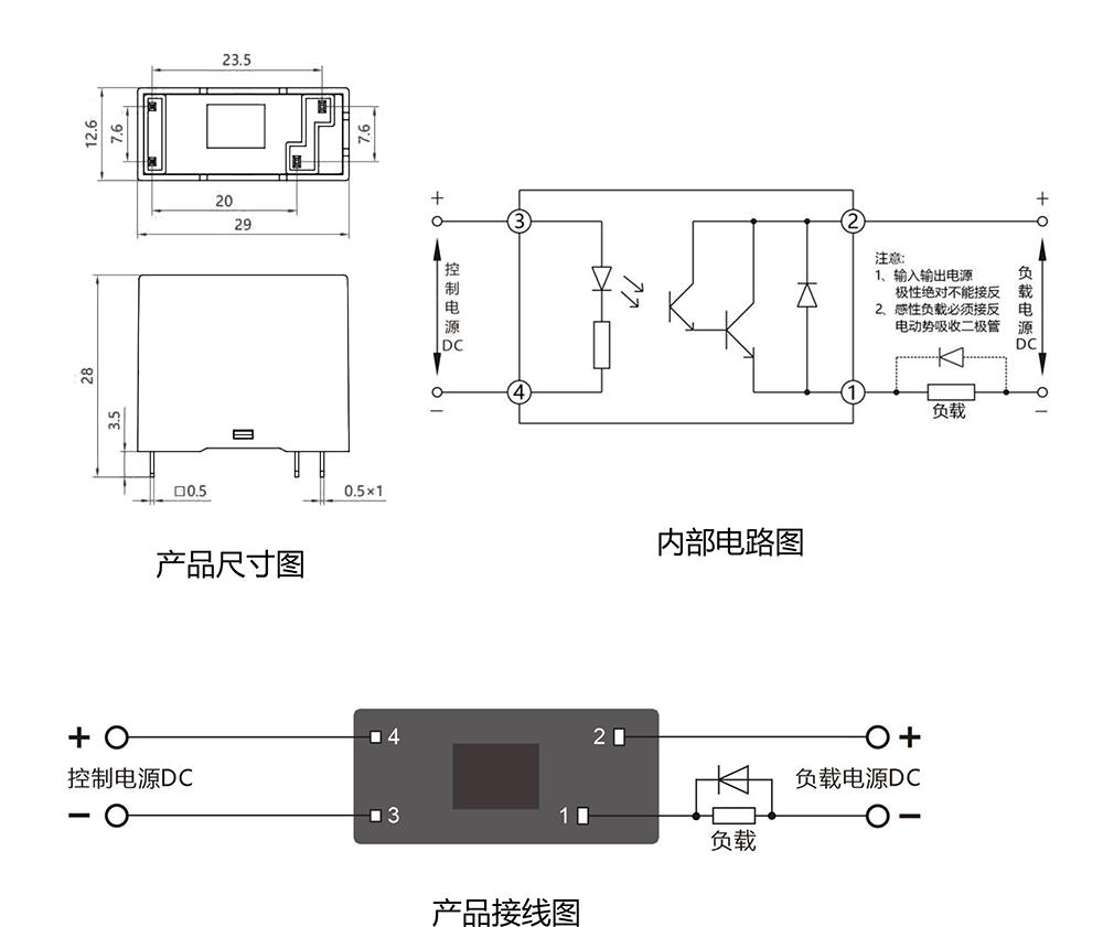 ⑤壓敏電阻的選用:負載為感性負載時,請務必在產品輸出端并接一壓敏電阻,取值為負載電壓的1.8-2 倍。