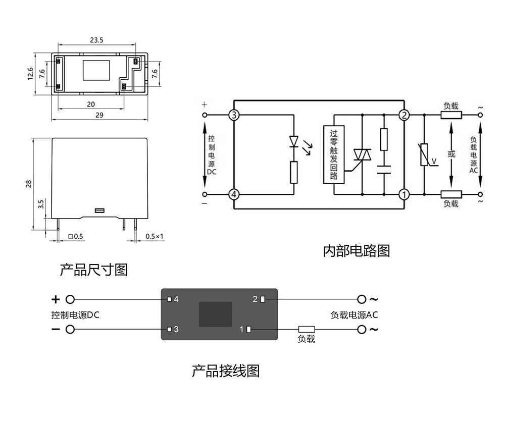 產品技術參數控制電壓 3-32VDC 控制電流 5-25mA 接通電壓 3VDC 關斷電壓 1VDC 反向電壓 32VDC 負載電壓 22:24-240VA 38:24-440VAC 負載電流 1A、2A、3A、4A