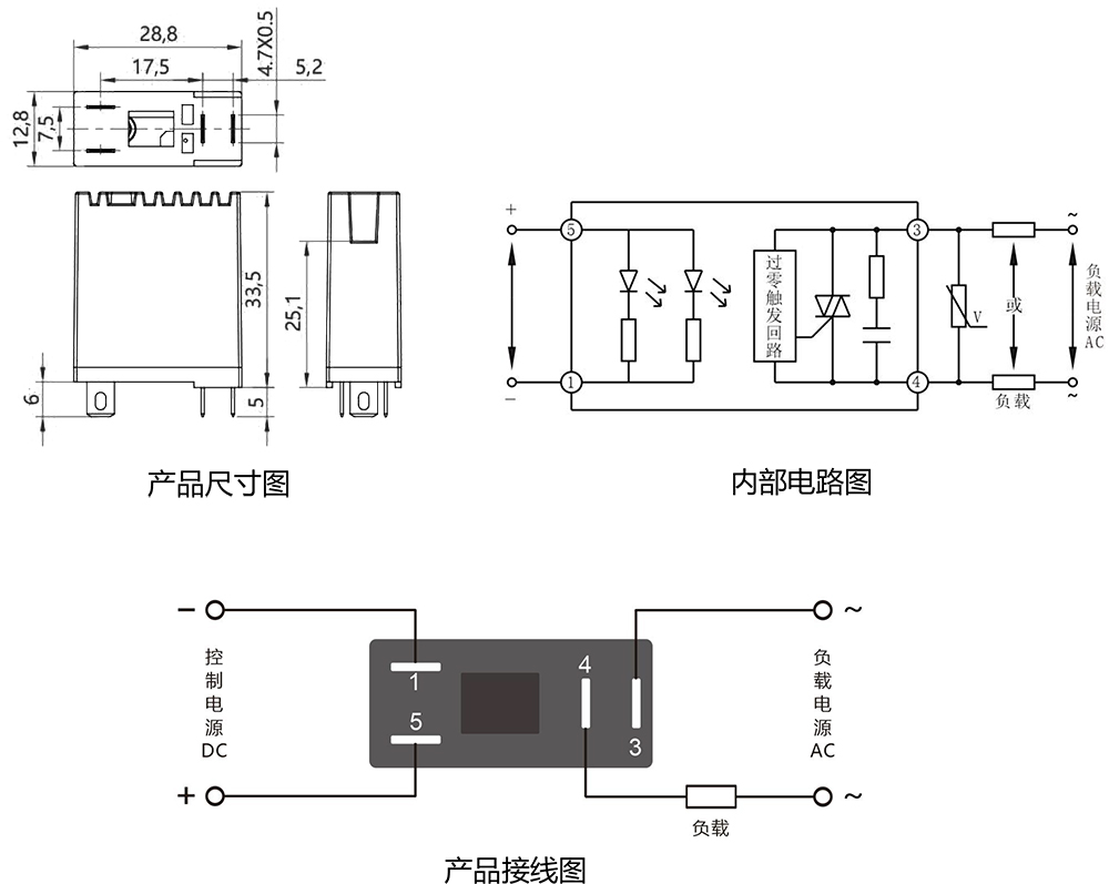 產品技術參數控制電壓 3-32VDC 控制電流 5-25mA 接通電壓 3VDC 關斷電壓 1VDC 反向電壓 32VDC 負載電壓 22:24-240VA 38:24-440VAC 負載電流 5A