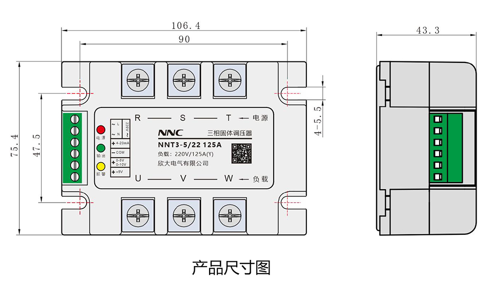 90×47.5mm 重量 25-40A≈430g、75-180A≈560g 安裝形式 螺栓安裝 工作指示 LED 說明 負載5A 以上必須安裝散熱器,60℃以上必須加風扇強冷或者水冷