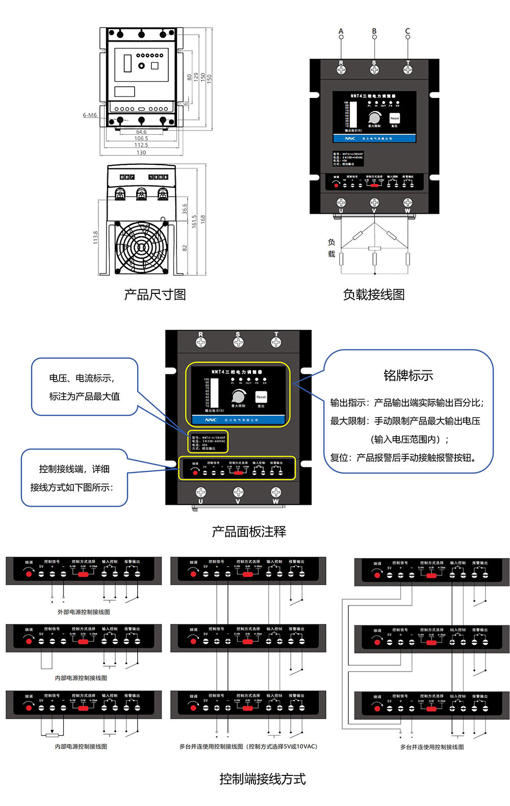 產品技術參數控制方式 DC 0-5V、DC0-10V、DC4-20mA、10KΩ手動電位器,四種方式可選 輸出方式 相位輸出、移相范圍0-150° 調壓范圍 200-440VAC 負載電壓 三相380VAC(三相三線) 負載電流 40A 保護功能 aR 型快速熔斷器 報警功能 斷相和超溫報警,繼電器輸出(1A/250VAC) 隔離電壓 有源型全隔離 介質耐壓 ≥2000VAC 輸出端-散熱板 顯示功能 LED 面板顯示SCR 輸出百分比及工作狀態指示 使用負載 定阻抗電熱絲、IR 遠紅外線、UV 燈管等 環境溫度 溫度-10~55℃濕度90%RH 以下 產品重量 ≈2170g 外形尺寸 150×130×168mm 安裝尺寸 116×80mm 安裝形式 螺栓安裝 冷卻方式 強制風冷 產品尺寸及接線方式