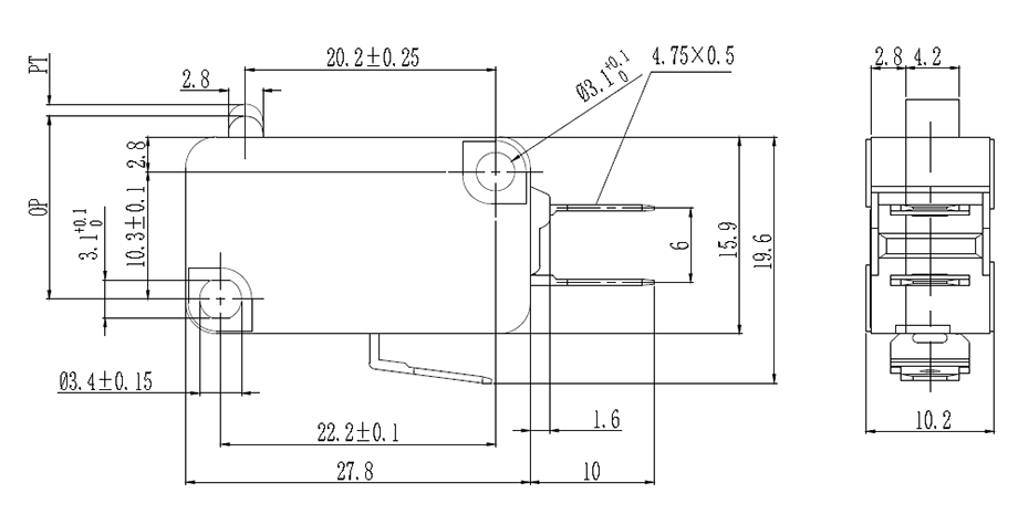 動作特性\型號 NV-21-1□6 NV-16-1□5 NV-16-1□4 動作力 OF最大 3.92N 1.96N 0.98N 回復力 RF最小 0.78N 0.49N 0.2N 預行程 PT最大 1.2mm 過行程 OT最小 1.0mm 響應差的行程 MD最大 0.4mm 動作位置 OP 14.7±0.4mm 使用方法