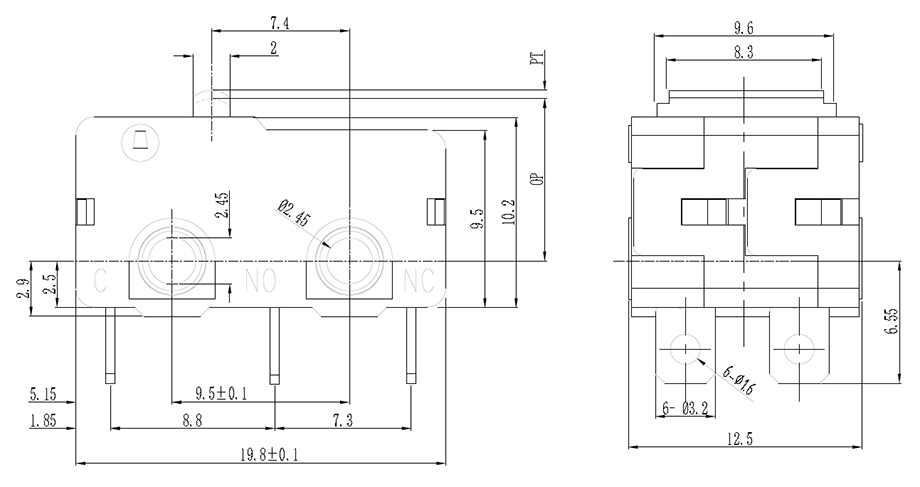 NL-5-F2-SZOF 動 作 力 3.2±0.6N RF 釋 放 力 最小1.5N PT 工作行程 最大0.6mm OT 超越行程 最小0.5mm MD 差動行程 最大0.2mm OP 動作位置 8.75±0.2mm