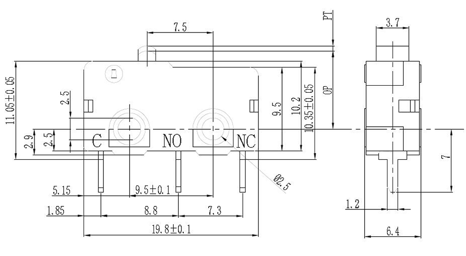 NL-5D-F3OF 動 作 力 0.8±0.3 1.5±0.4 2.3±0.4 3.2±0.5 RF 釋 放 力 最小0.15N 最小0.35N 最小0.55N 最小0.55N PT 工作行程 最大0.6mm 最大0.6mm 最大0.6mm 最大0.6mm OT 超越行程 最小0.5mm 最小0.5mm 最小0.5mm 最小0.5mm MD 差動行程 最大0.2mm 最大0.2mm 最大0.2mm 最大0.2mm OP 動作位置 8.55±0.2mm