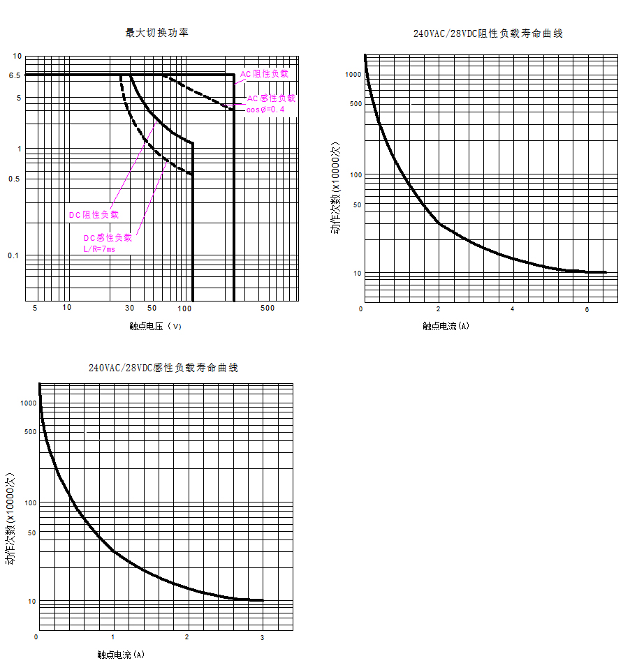 觸點類型 2C(Z)-轉換 2A(H)-常開 2B(D)-常閉 接觸電阻 100mΩ以下(在6VDC 1A條件下) 觸點材料 銀合金 觸點額定負載 6.5A 240VAC 最大切換電壓 240VAC/28VDC 最大切換電流 6.5A 最大切換功率 1560VA/182W 最小切換負載 5V 10mA 電氣耐久性 阻性負載, 10萬次以上 機械耐久性 1000萬以上 特性參數