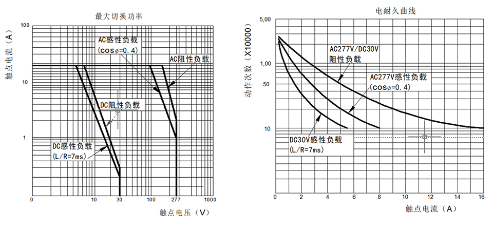 認證類別 CQC UL TUV 證書號 CQC22002357184 E235027 R50558307 負載要求 277VAC/30VDC 277VAC/30VDC 277VAC/30VDC 性能曲線圖