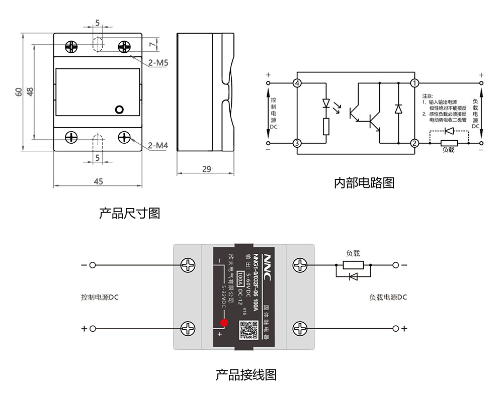 產品技術參數控制電壓 3-32VDC 控制電流 10-45mA 接通電壓 5VDC 關斷電壓 1VDC 反向電壓 32VDC 負載電壓 5-60VDC 負載電流 100A