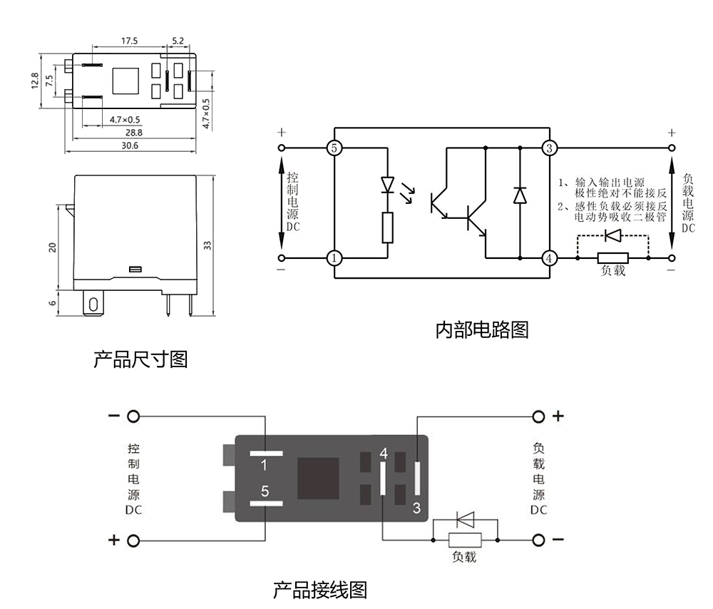 產品技術參數控制電壓 3-32VDC 控制電流 5-25mA 接通電壓 3VDC 關斷電壓 1VDC 反向電壓 32VDC 負載電壓 12-200VDC 負載電流 1A、2A、3A、4A
