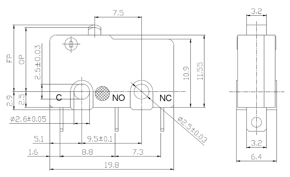 動作特性\型號(hao) NS-102MP NS-52MP 動作力 OF最大 2.2N 回(hui)復(fu)力 RF最小 0.3N 預行程 PT最大 1.0mm 過行程(cheng) OT最小 0.5mm 響應差行程(cheng) MD最(zui)大 0.2mm 自(zi)由位置 FP最大 10.8mm 動作位置 OP 10±0.5mm