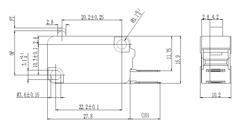 動作特性\型號 NV-21-3□6-C6H001 NV-16-3□5-C6H001 NV-16-3□4-C6H001 OF 動作力 最大3.0N 最大1.96N 最大0.98N RF 釋放力 最小0.78N 最小0.49N 最小0.2N PT 工作行程 最大1.2mm OT 超越行程 最小1.0mm MD 差動行程 最大0.4mm OP 動作行程 14.9±0.5mm