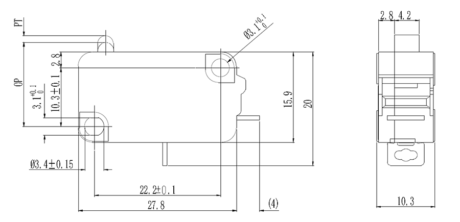 動作特性\型號 NV-21-3A6-D006 NV-16-3A5-D006 NV-16-3A4-D006 OF 動作力 最大3.92N 最大1.96N 最大0.98N RF 釋放力 最小0.78N 最小0.49N 最小0.2N PT 工作行程 最大1.2mm OT 超越行程 最小1.0mm MD 差動行程 最大0.4mm OP 動作行程 14.4±0.4mm