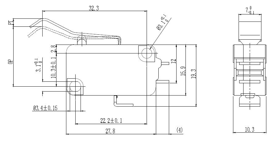 動作特性\型號 NV-21W14-1A6-HD003 NV-16W14-1A5-HD003 NV-21W14-1A4-HD003 OF 動作力 最大2.45N 最大1.23N 最大0.59N RF 釋放力 最小0.25N 最小0.14N 最小0.06N PT 工作行程 最大4.0mm OT 超越行程 最小1.6mm MD 差動行程 最大1.5mm OP 動作行程 20±1.2mm